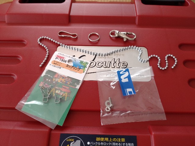 フタの穴にリングを付けます。ボールチェーンを通したカップリングに、色々とフックを付けて着脱可能にします。